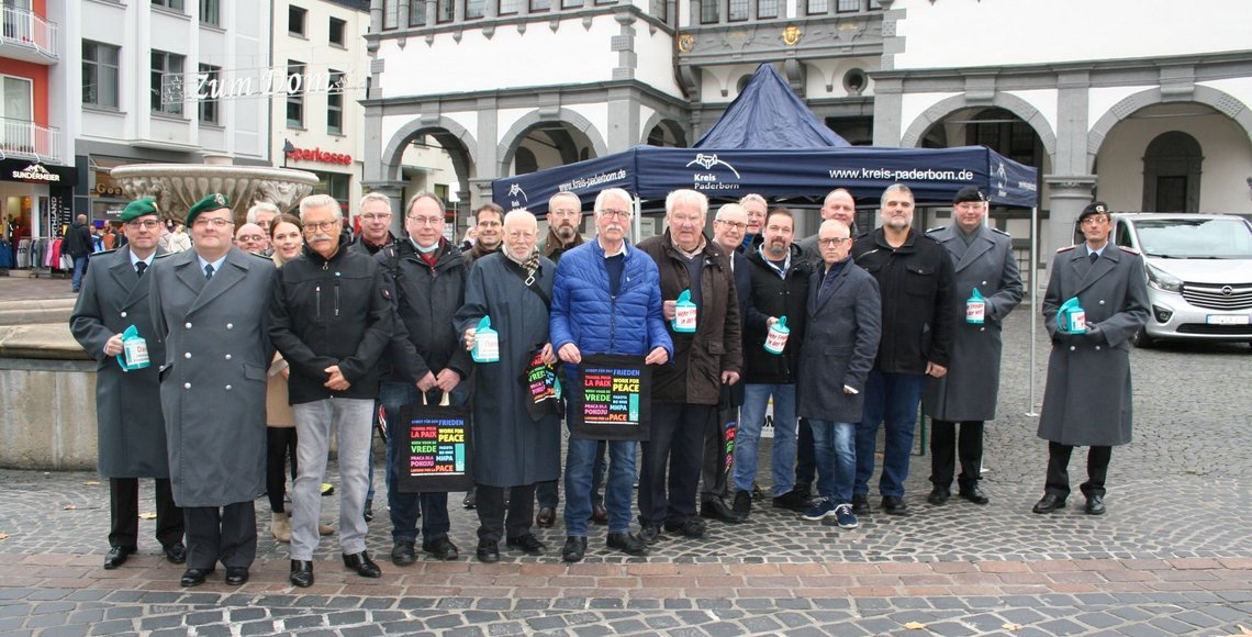 Die Vertreter*innen des Volksbundes informierten die Passanten in Paderborn über Projekte der Jugendarbeit. Kreisvorsitzender Manfred Müller erinnerte daran, dass seit dem Ende des Zweiten Weltkrieges vor über 70 Jahren in Europa Frieden herrsche, den es zu erhalten gilt. Die Sammler*innen des Volksbundes sind dafür noch in diesem Monat in den Städten und Gemeinden des Kreises unterwegs. Auch die befreundeten Patenkompanien aus Augustdorf unterstützen die Sammlung in den jeweiligen Orten.