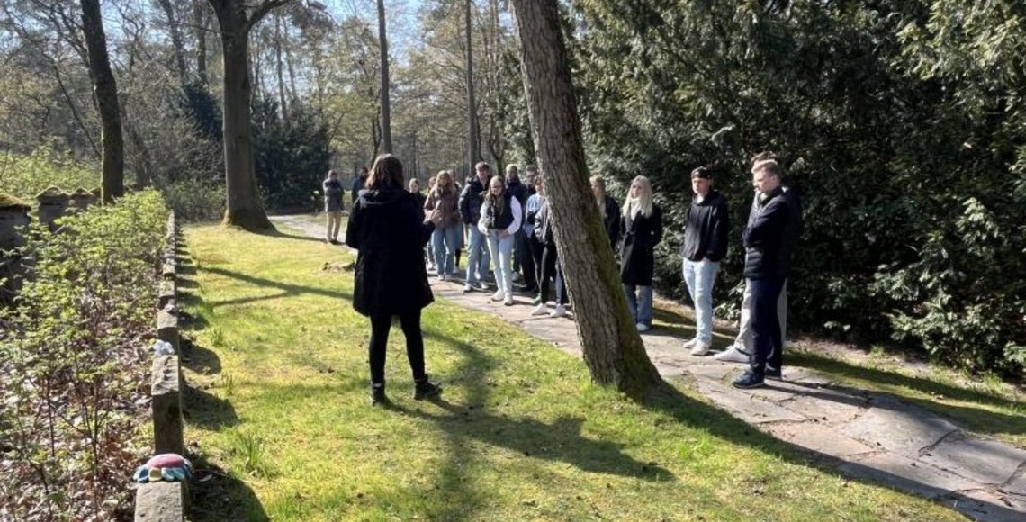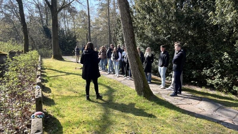 Zum Einstieg in das Thema bekam die Gruppe am ersten Tag eine Führung durch die Gedenkstätte sowie über den nahegelegenen Ehrenfriedhof sowjetischer Kriegstoter. Dort erhielten die Teilnehmenden Einblicke in die Geschichte des Lagers, das während des Zweiten Weltkriegs als Gefangenenlager für zumeist sowjetische Soldaten diente. Anschließend arbeiteten die Schüler und Schülerinnen mit historischen Exponaten und Zeitzeugenberichten, die die Gedenkstätte zur Verfügung stellte.