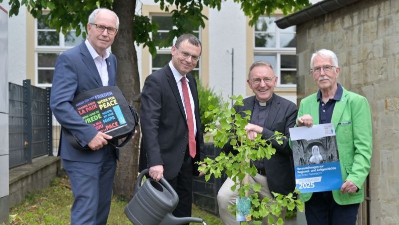 „Dechant und Domkapitular Benedikt Fischer, Landrat a. D. Manfred Müller, Pfarrer Dr. Eckhard Düker vom Evangelischen Kirchenkreis Paderborn und Hermann-Josef Bentler als Kreisvorstandsmitglied des Volksbundes Deutsche Kriegsgräberfürsorge pflanzten am Donnerstag, 5. Juni 2025, im Innenhof des Forums St. Liborius einen Ginkgo-Baum als Hoffnungszeichen des Friedens. ‘So wie dieser Ginkgo Wurzeln schlagen und wachsen soll, so soll auch der Frieden bei uns, in Deutschland, Europa und der Welt gedeihen’, betonte Dechant Fischer. Der Ginkgo erinnert an den ökumenischen Gottesdienst am 8. Mai 2025 mit zahlreichen Gläubigen im Paderborner Dom anlässlich des 80. Jahrestages des Endes des Zweiten Weltkriegs in Europa.