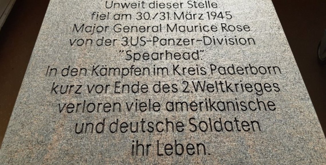 Borchen. Gedenkveranstaltung 77 Jahre nach dem Ende des Zweiten Weltkrieges: Enthüllung eines Gedenksteins für Major General Maurice Rose und für alle deutschen und amerikanischen Opfer des Zweiten Weltkrieges am Mittwoch, 30. März, 16 Uhr, an der Dörenhagener Straße, Abzweig Schloß Hamborn.